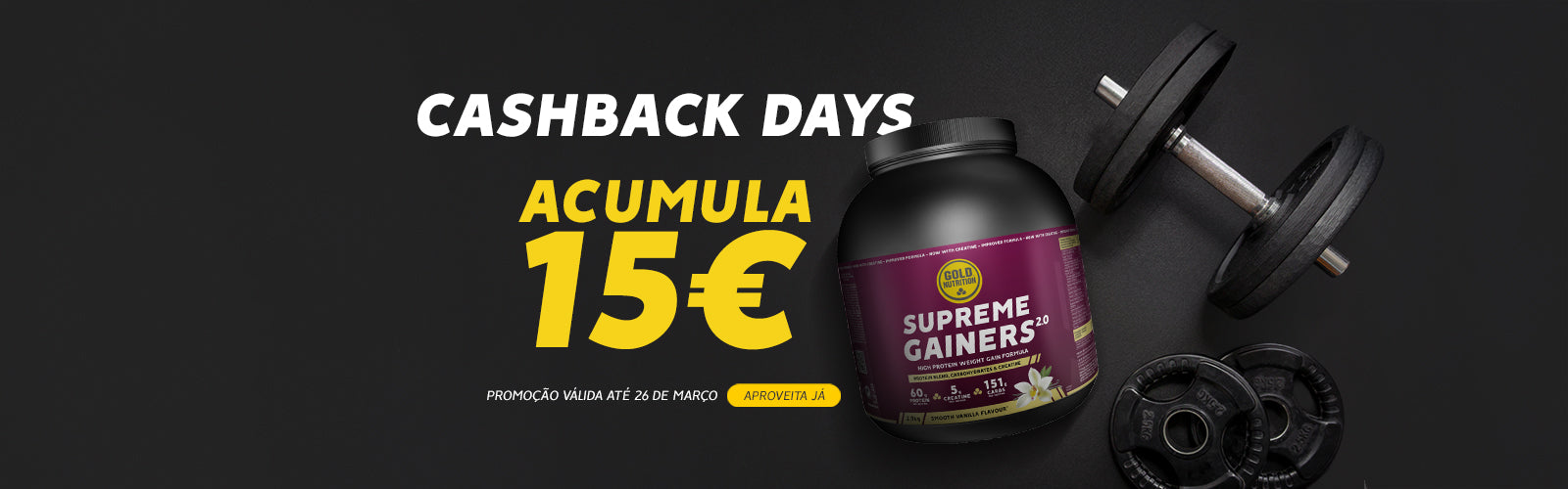 Na compra do teu Supreme Gainers até 26 de março, oferecemos-te 15€ de Cashback para gastares em abril!