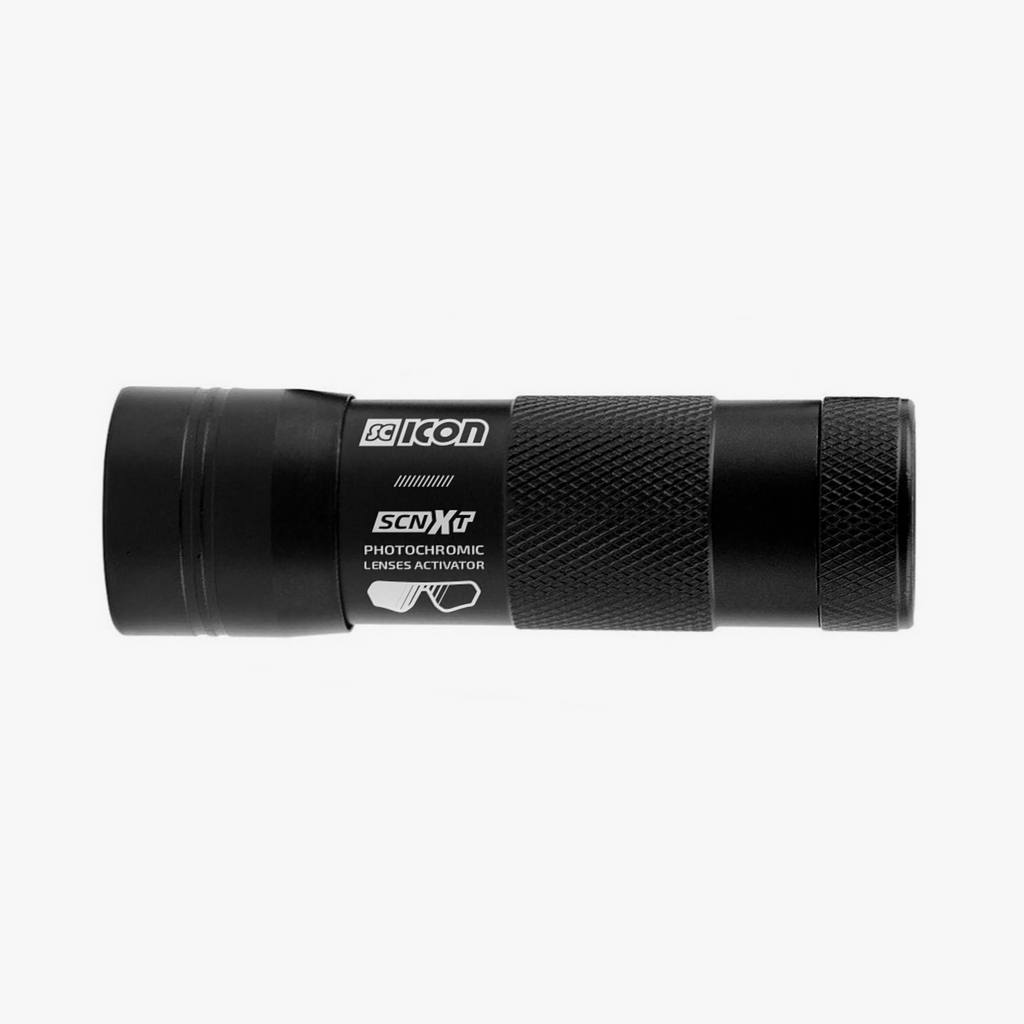 The UV Light Activator LED Torch is a professional tool designed to demonstrate how photochromic lenses react to UV exposure. When directed at Scicon Sports SCN-XT™ photochromic lenses, the torch triggers rapid lens darkening to showcase real-time performance. Featuring advanced photochromic technology, SCN-XT™ lenses activate and fade faster while maintaining long-term durability.